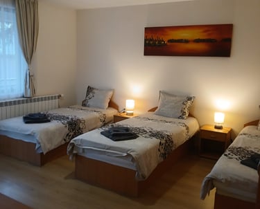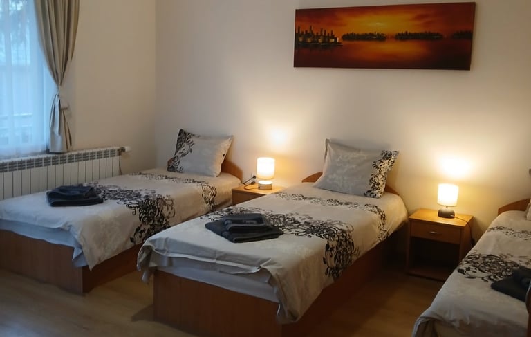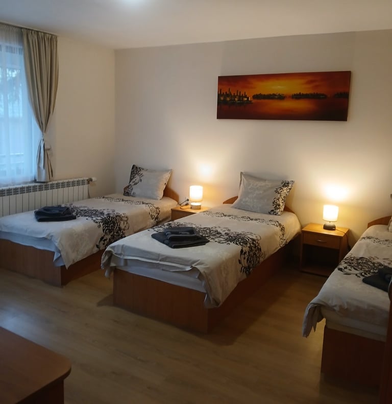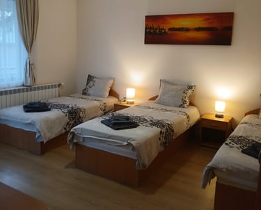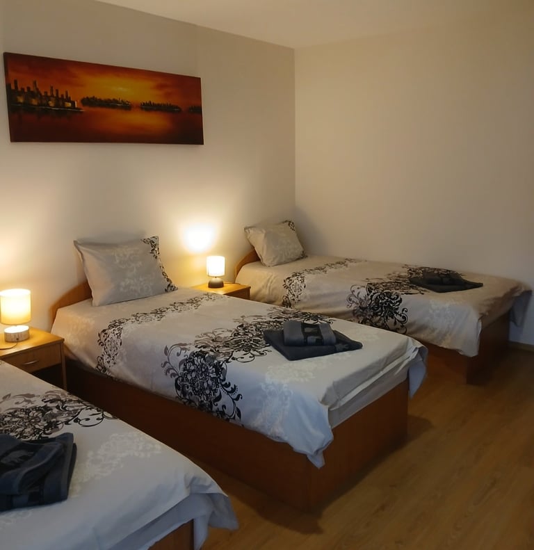 One room with three single beds