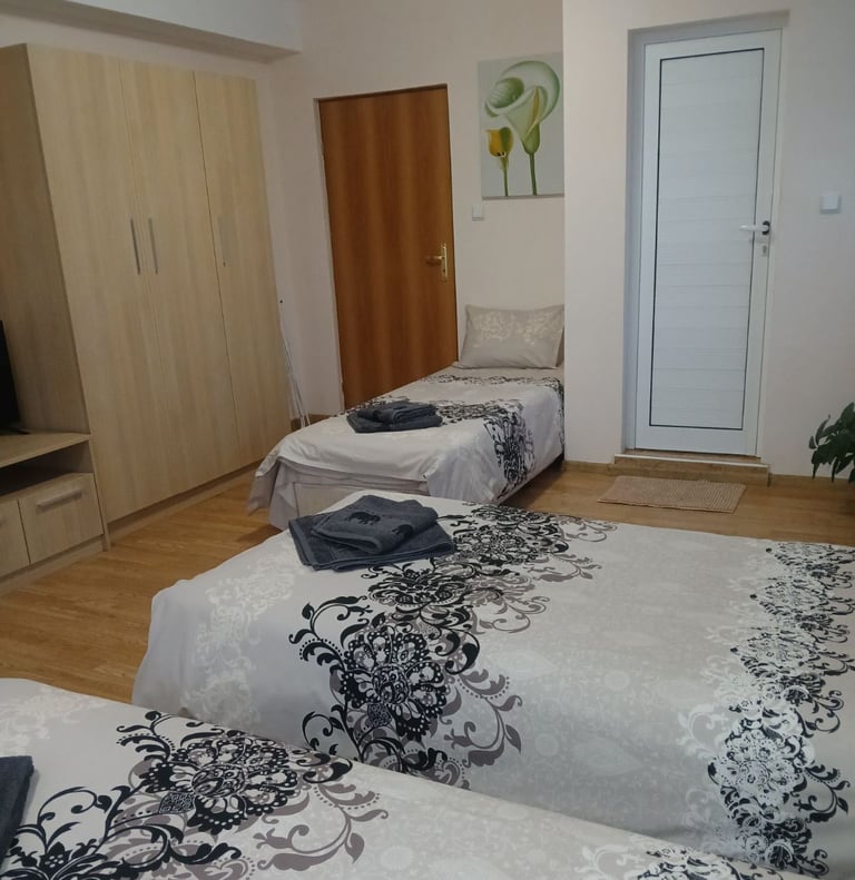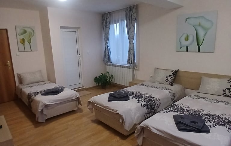 Room with three single beds
